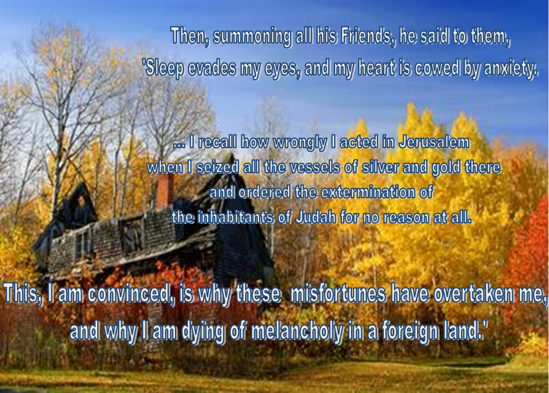 I am dying of melancholy because of the wrong I did in Jerusalem (around 175 B.C. to 134 B.C.) - Extracted from 1 Maccabees, Chapter 6 :