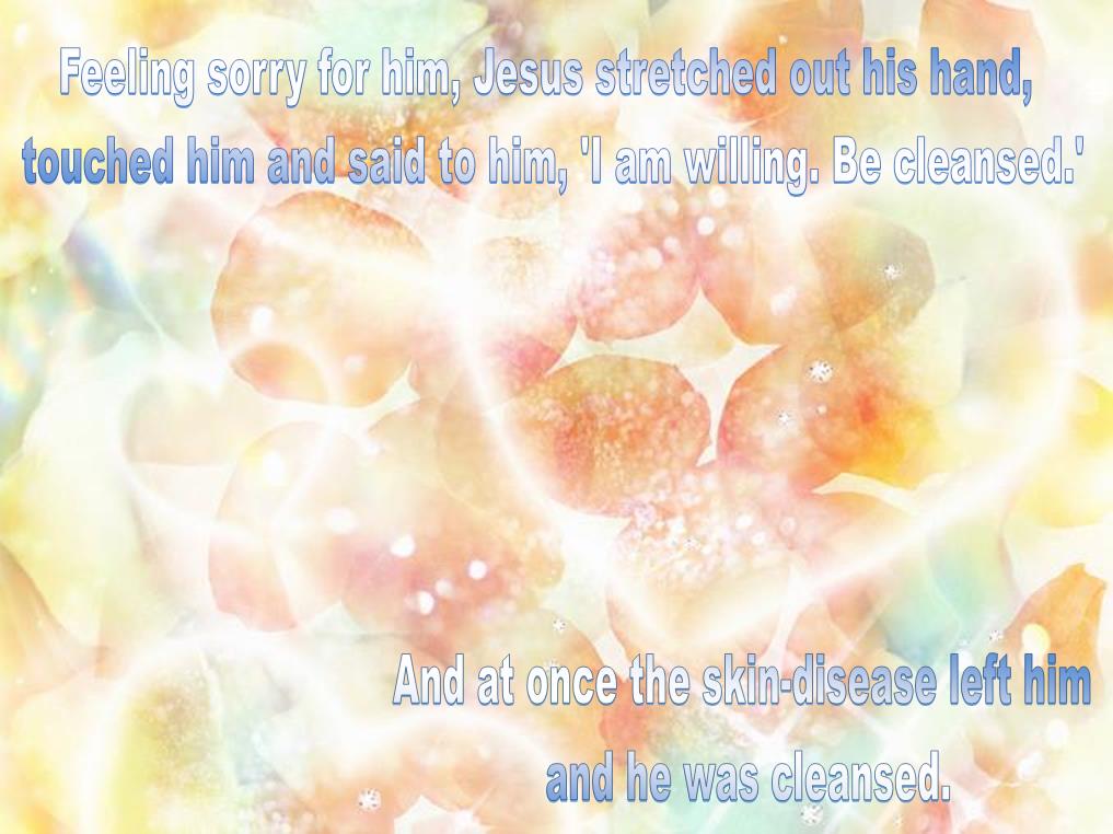 41 Feeling sorry for him, Jesus stretched out his hand, touched him and said to him, 'I am willing. Be cleansed.'