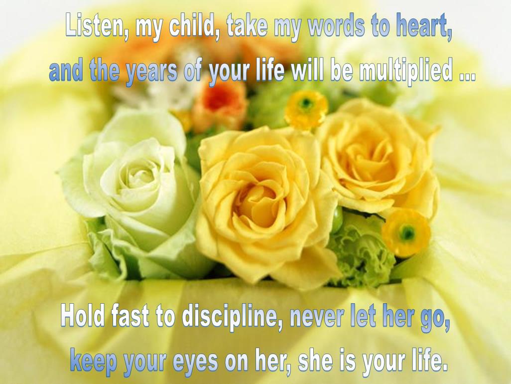 13 Hold fast to discipline, never let her go, keep your eyes on her, she is your life.