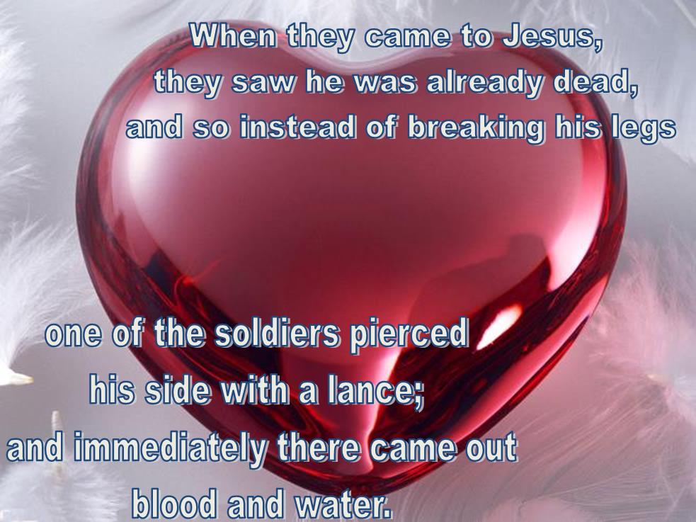 One of the soldiers pierced his side with a lance; and immediately there came out blood and water -Extracted from the Gospel of John, Chapter 19: