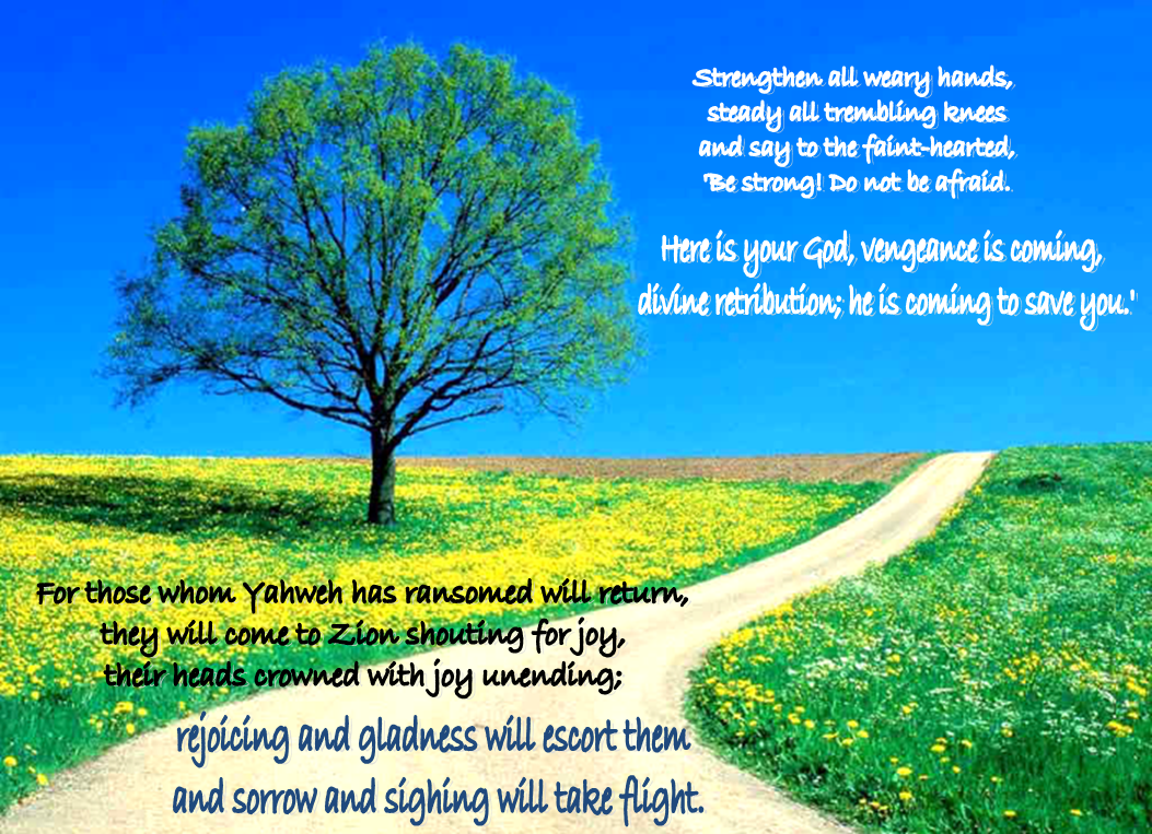 4 and say to the faint-hearted, 'Be strong! Do not be afraid. Here is your God, vengeance is coming, divine retribution; he is coming to save you.'