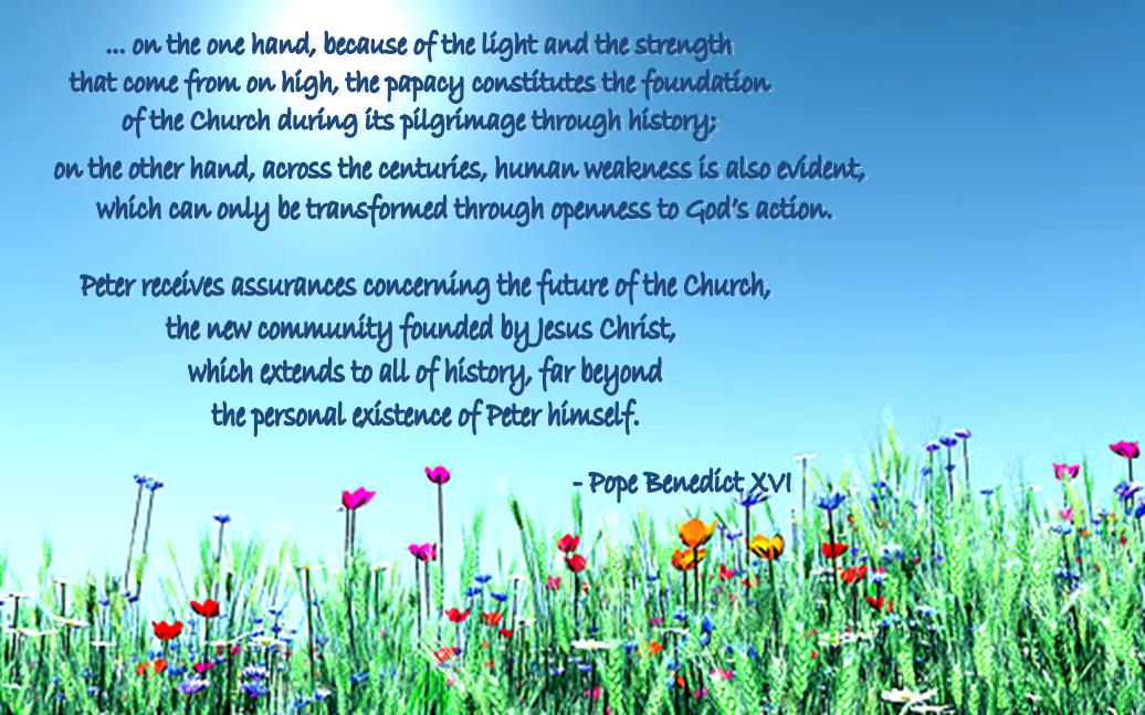 15 July 2012 Homily of Pope Benedict XVI on the Solemnity of Saints Peter & Paul, 29 June 2012, Friday @ the Vatican Basilica—Extracted in part only In the passage from Saint Matthew’s Gospel that we have just heard, Peter makes his own confession of faith in Jesus, acknowledging him as Messiah and Son of God. He does so in the name of the other Apostles too. In reply, the Lord reveals to him the mission that he intends to assign to him, that of being the “rock”, the visible foundation on which the entire spiritual edifice of the Church is built (cf. Mt 16:16-19). But in what sense is Peter the rock? How is he to exercise this prerogative, which naturally he did not receive for his own sake? The account given by the evangelist Matthew tells us first of all that the acknowledgment of Jesus’ identity made by Simon in the name of the Twelve did not come “through flesh and blood”, that is, through his human capacities, but through a particular revelation from God the Father. By contrast, immediately afterwards, as Jesus foretells his passion, death and resurrection, Simon Peter reacts on the basis of “flesh and blood”: he “began to rebuke him, saying, this shall never happen to you” (16:22). And Jesus in turn replied: “Get behind me, Satan! You are a hindrance to me ...” (16:23). The disciple who, through God’s gift, was able to become a solid rock, here shows himself for what he is in his human weakness: a stone along the path, a stone on which men can stumble – in Greek, skandalon. Here we see the tension that exists between the gift that comes from the Lord and human capacities; and in this scene between Jesus and Simon Peter we see anticipated in some sense the drama of the history of the papacy itself, characterized by the joint presence of these two elements: on the one hand, because of the light and the strength that come from on high, the papacy constitutes the foundation of the Church during its pilgrimage through history; on the other hand, across the centuries, human weakness is also evident, which can only be transformed through openness to God’s action.