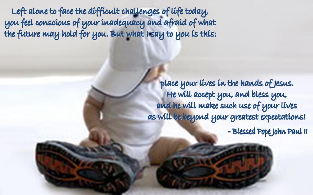 You are at the great crossroads of your lives and you must decide how your future can be lived happily, accepting the responsibilities which you hope will be placed squarely on your shoulders, playing an active role in the world around you. You ask me for encouragement and guidance, and most willingly I offer some words of advice to all of you, in the name of Jesus Christ.