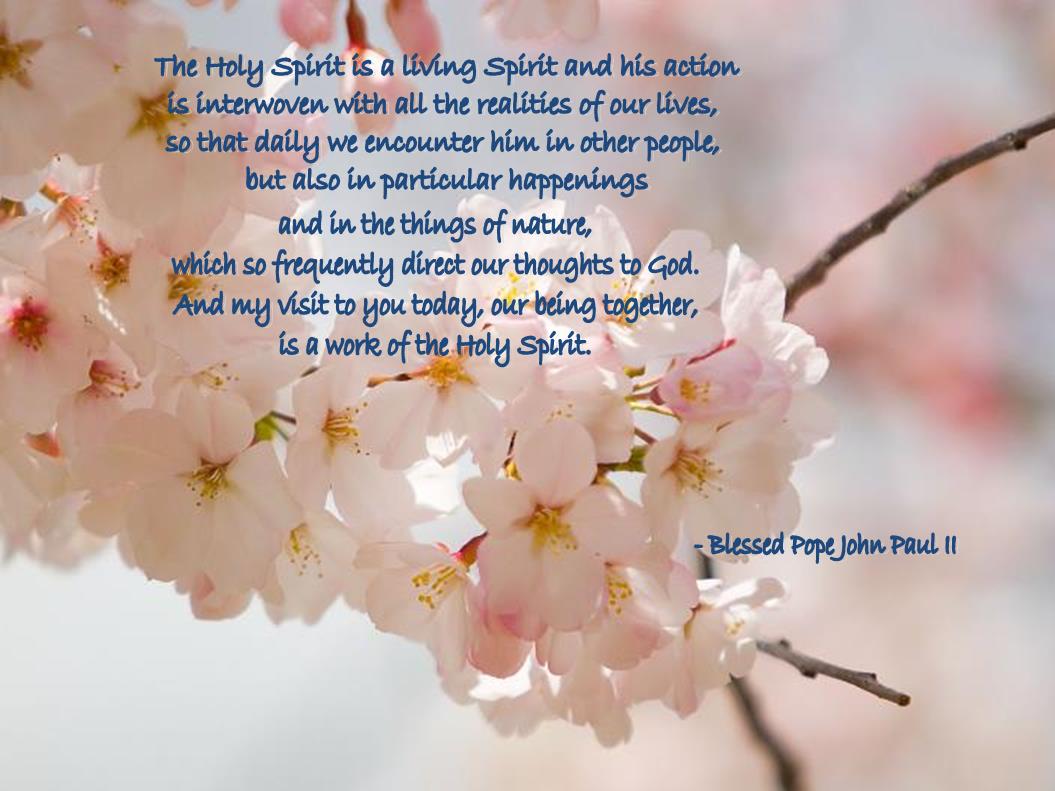 If you pause to reflect for a moment or two you will begin to realize how much you experience the presence of the Holy Spirit in your lives, especially through the goodness and kindness that other people show to you, even though you do not actually see him in the world. The Holy Spirit is a living Spirit and his action is interwoven with all the realities of our lives, so that daily we encounter him in other people, but also in particular happenings and in the things of nature, which so frequently direct our thoughts to God. And my visit to you today, our being together, is a work of the Holy Spirit. |