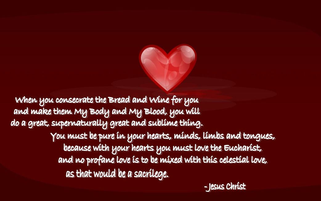 When you consecrate the Bread and Wine for you and make them My Body and My Blood, you will do a great, supernaturally great and sublime thing. In order to accomplish it worthily you must be pure, because you will touch Him Who is the Pure One and you will nourish yourselves with the Flesh of a God. You must be pure in your hearts, minds, limbs and tongues, because with your hearts you must love the Eucharist, and no profane love is to be mixed with this celestial love, as that would be a sacrilege. Pure in your minds, because you must believe and understand this mystery of love, and the impurity thought kills Faith and Intellect. The science of the world remains, but the Wisdom of God dies in you. You must be pure in your limbs, because the Word will descend into your bosoms, as it descended into Mary’s womb by deed of the Love.