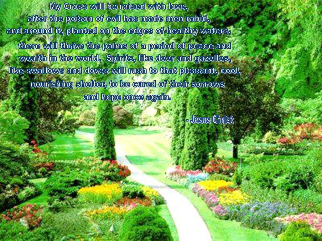 I see…, I look at future ages… Time and the infinite crowds of men will exist are all in front of Me… I see… massacres and wars, false peace treaties and horrible slaughters, hatred and robbery, sensuality and pride. Now and again a green oasis: a period of return to the Cross. Like an obelisk that indicates pure water among the arid sans of the desert, My Cross will be raised with love, after the poison of evil has made men rabid, and around it, planted on the edges of healthy waters, there will thrive the palms of a period of peace and wealth in the world. Spirits, like deer and gazelles, like swallows and doves will rush to that pleasant, cool, nourishing shelter, to be cured of their sorrows and hope once again. And it will gather its branches close together like a dome as a protection from storms and dog-days and will keep away serpents and wild animals with the Sign that put Evil to flight. And it will be so, as long as men so wish.