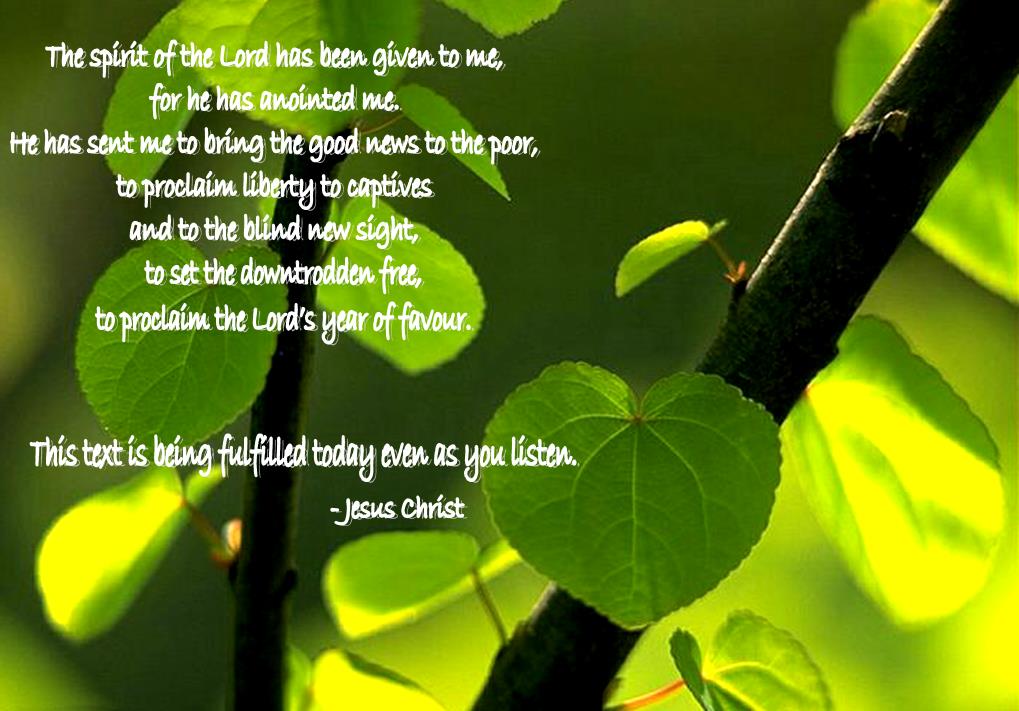 The spirit of the Lord has been given to me, for he has anointed me. He has sent me to bring the good news to the poor, to proclaim liberty to captives and to the blind new sight, to set the downtrodden free, to proclaim the Lord’s year of favour.