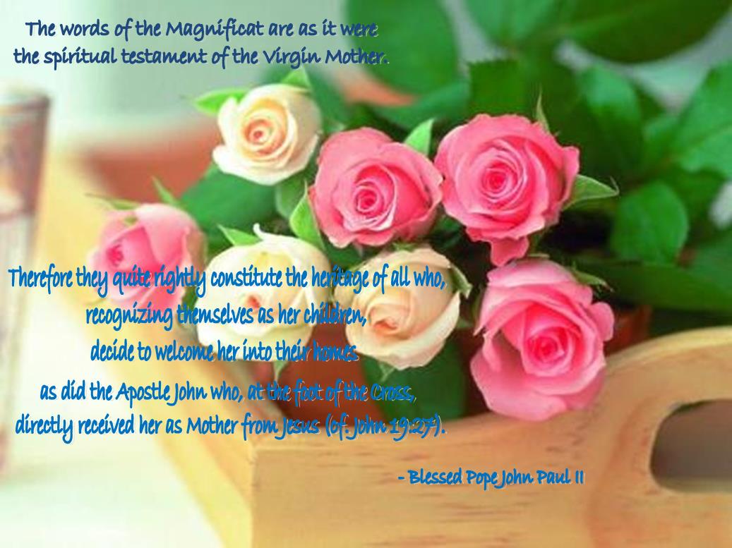 At today’s solemnity the ecclesial community renews Mary’s song of thanksgiving: it does so as the People of God and asks every believer to join in the chorus of praise to the Lord. St Ambrose already urged this in the early centuries: “In each one may the soul of Mary praise the Lord and the spirit of Mary exult in God” (St Ambrose, Exp. Ev. Luc., II, 26). The words of the Magnificat are as it were the spiritual testament of the Virgin Mother. Therefore they quite rightly constitute the heritage of all who, recognizing themselves as her children, decide to welcome her into their homes as did the Apostle John who, at the foot of the Cross, directly received her as Mother from Jesus (cf. John 19:27).