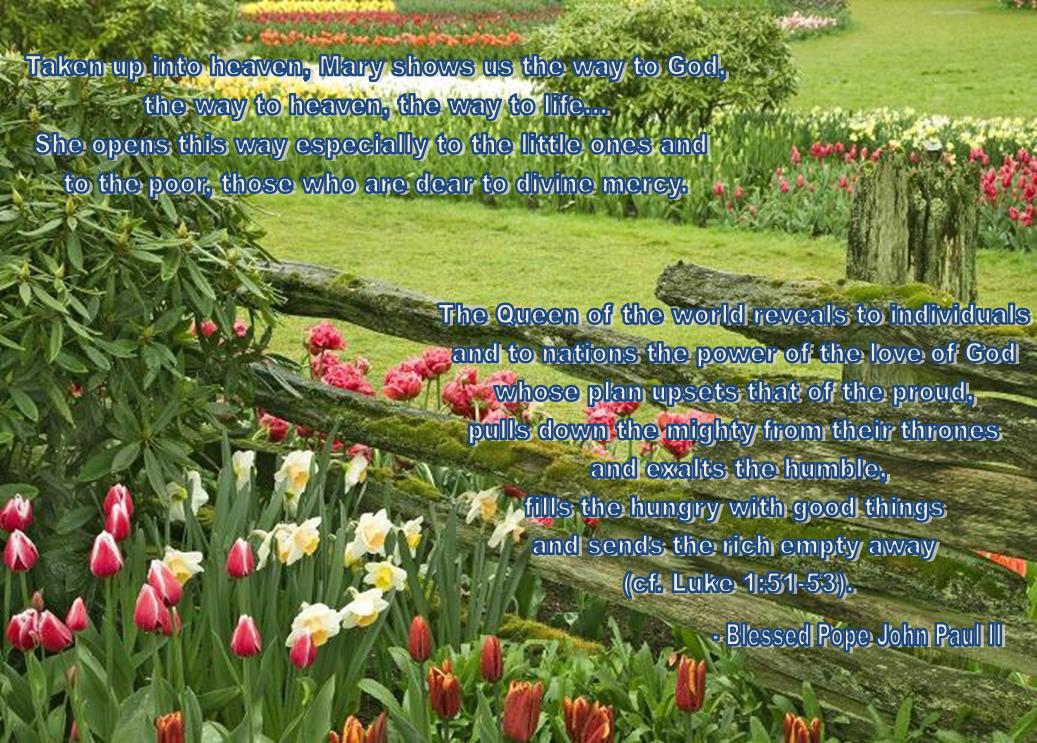 Taken up into heaven, Mary shows us the way to God, the way to heaven, the way to life. She shows it to her children baptized in Christ and to all people of good will. She opens this way especially to the little ones and to the poor, those who are dear to divine mercy. The Queen of the world reveals to individuals and to nations the power of the love of God whose plan upsets that of the proud, pulls down the mighty from their thrones and exalts the humble, fills the hungry with good things and sends the rich empty away (cf. Luke 1:51-53).