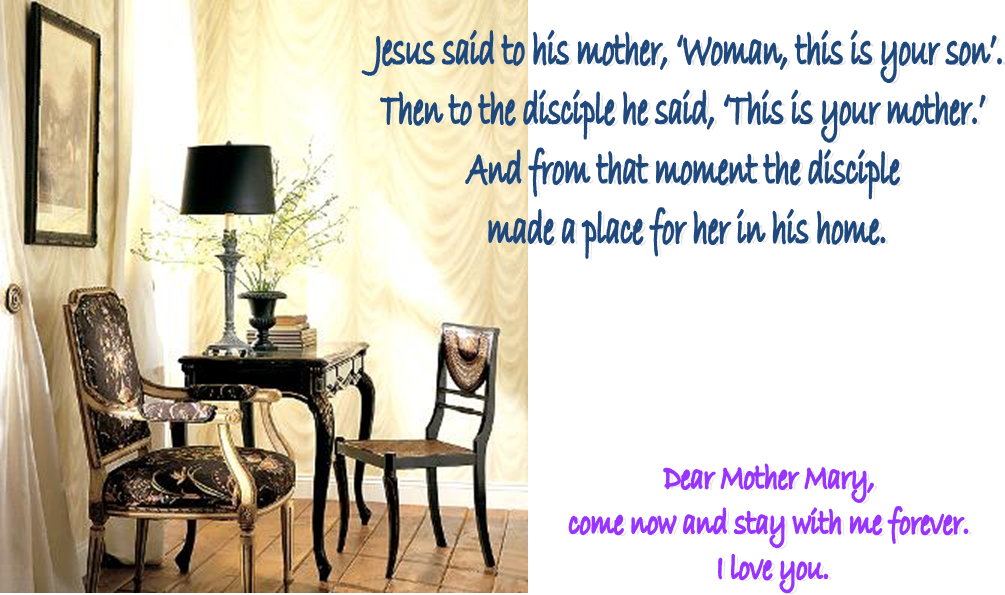 Seeing his mother and the disciple he loved (referred to the Apostle John i.e. John the Evangelist) standing near her, Jesus said to his mother, ‘Woman, this is your son’. Then to the disciple he said, ‘This is your mother.’