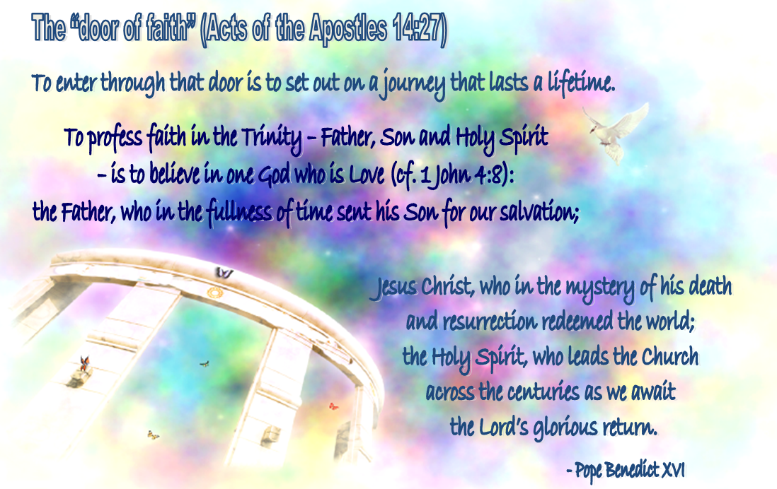 1. The “door of faith” (Acts of the Apostles 14:27) is always open for us, ushering us into the life of communion with God and offering entry into his Church. It is possible to cross that threshold when the word of God is proclaimed and the heart allows itself to be shaped by transforming grace. To enter through that door is to set out on a journey that lasts a lifetime. It begins with baptism (cf. Romans 6:4), through which we can address God as Father, and it ends with the passage through death to eternal life, fruit of the resurrection of the Lord Jesus, whose will it was, by the gift of the Holy Spirit, to draw those who believe in him into his own glory (cf. John 17:22). To profess faith in the Trinity – Father, Son and Holy Spirit – is to believe in one God who is Love (cf. 1 John 4:8): the Father, who in the fullness of time sent his Son for our salvation; Jesus Christ, who in the mystery of his death and resurrection redeemed the world; the Holy Spirit, who leads the Church across the centuries as we await the Lord’s glorious return.