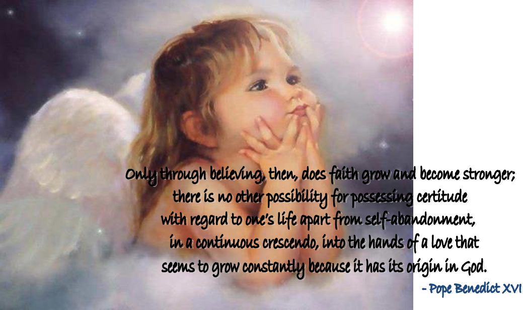 Only through believing, then, does faith grow and become stronger; there is no other possibility for possessing certitude with regard to one’s life apart from self-abandonment, in a continuous crescendo, into the hands of a love that seems to grow constantly because it has its origin in God. Continue next page ... |