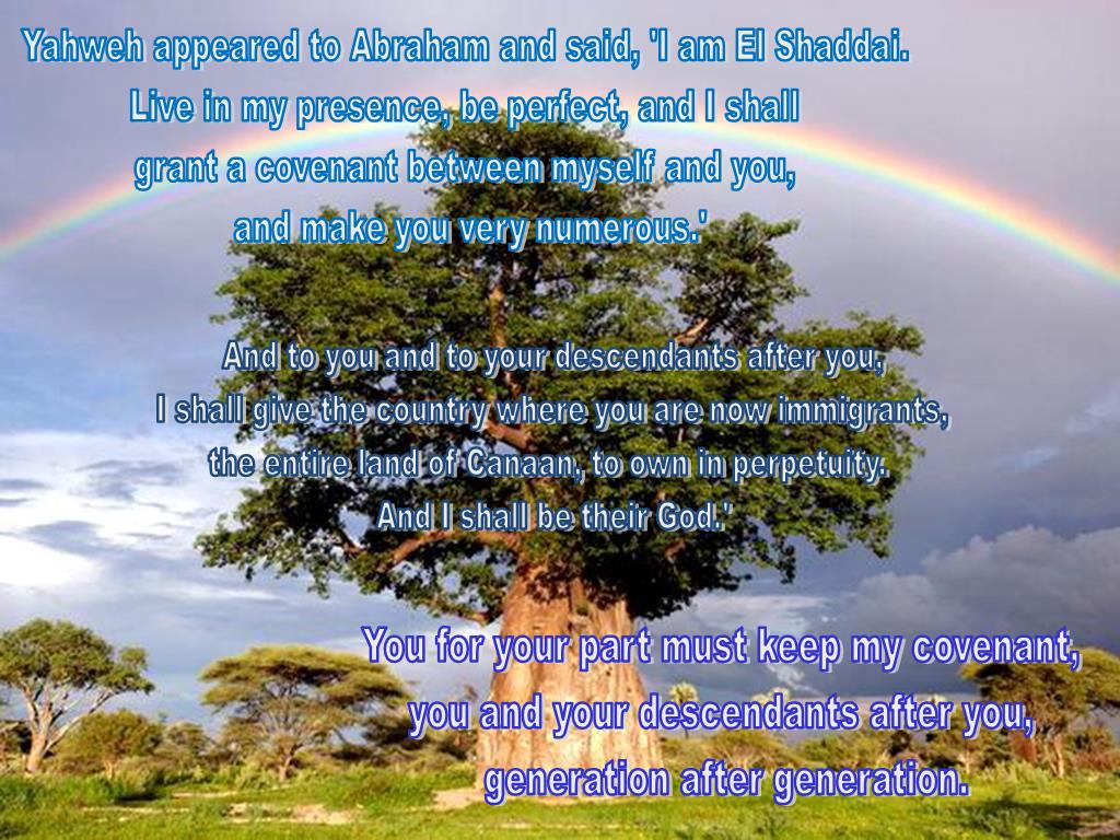 1 When Abram was 99 years old Yahweh appeared to him and said, 'I am El Shaddai. Live in my presence, be perfect,