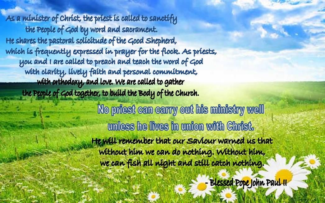 7. No priest can carry out his ministry well unless he lives in union with Christ. His life, like Christ’s, must be marked by self-sacrifice, zeal for the spreading of the Kingdom of God, unblemished chastity, unstained charity. All this is possible only when the priest is a man of prayer and Eucharistic devotion. By praying the Liturgy of the Hours in union with the Church he will find strength and joy for the apostolate. In silent prayer before the Blessed Sacrament he will be constantly renewed in his consecration to Jesus Christ and confirmed in his permanent commitment to priestly celibacy. By invoking Mary the Mother of Jesus, the priest will be sustained in his generous service to all Christ’s brothers and sisters in the world. Yes, the priest must not allow the passing needs of the active apostolate to elbow out or eat into his prayer life. He must not be so engrossed with working for God that he is in danger of forgetting God himself. He will remember that our Saviour warned us that without him we can do nothing. Without him, we can fish all night and still catch nothing. |
