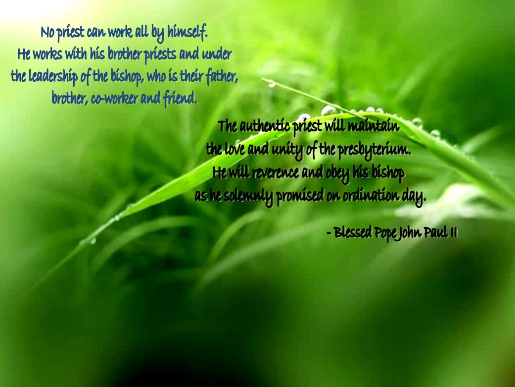 8. No priest can work all by himself. He works with his brother priests and under the leadership of the bishop, who is their father, brother, co-worker and friend. The authentic priest will maintain the love and unity of the presbyterium. He will reverence and obey his bishop as he solemnly promised on ordination day. The presbyterium of the bishop with all his priests, diocesan and religious, should function as a family, as an apostolic team marked with joy, mutual understanding and fraternal love. The presbyterium exists so that, through the renewal of Christ’s Sacrifice, the mystery of Christ’s saving love may enter the lives of God’s people. Priests must not forget to help their brother priests who are in difficulty: moral, spiritual, financial or otherwise. And the sick and the old priests find in your warmth of brotherly charity both solace and support. |