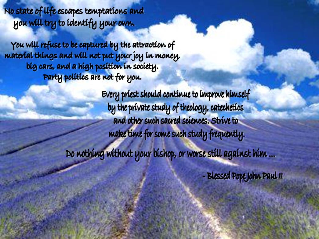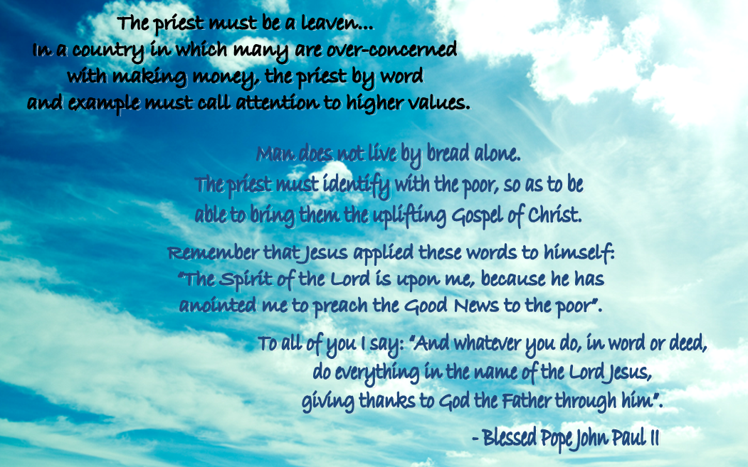 The priests who work in the mass media have a wonderful opportunity to share Christ with others, as do the spiritual directors of the religious and laity, the chaplains of all lay apostolate organizations, and the priests who recruit vocations to the priesthood and the religious life. To all of you I say: “And whatever you do, in word or deed, do everything in the name of the Lord Jesus, giving thanks to God the Father through him”.