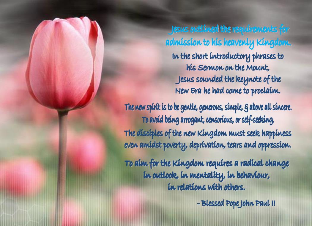 How astonished those first listeners must have been at hearing these dramatic words of Christ! Especially those who were poor in spirit, gentle, or afflicted, downtrodden and oppressed - to hear themselves proclaimed as eligible for entry into a heavenly Kingdom. |