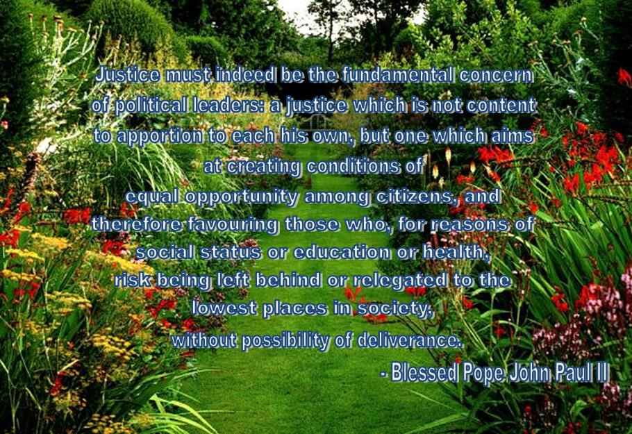 Justice must indeed be the fundamental concern of political leaders: a justice which is not content to apportion to each his own, but one which aims at creating conditions of equal opportunity among citizens, and therefore favouring those who, for reasons of social status or education or health, risk being left behind or relegated to the lowest places in society, without possibility of deliverance.