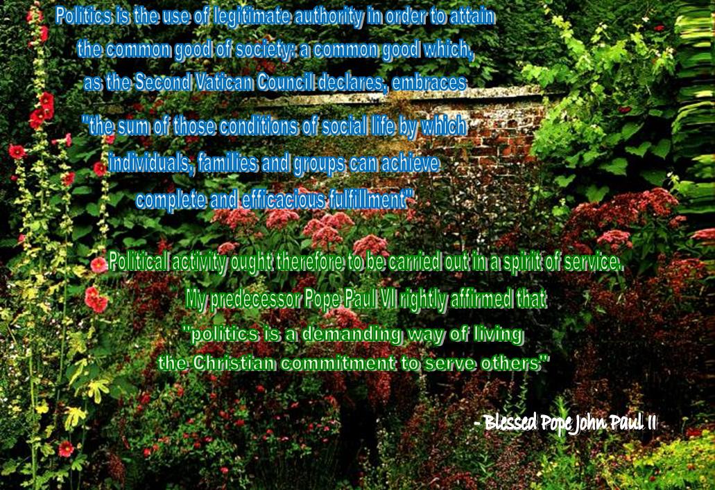 2. Politics is the use of legitimate authority in order to attain the common good of society: a common good which, as the Second Vatican Council declares, embraces "the sum of those conditions of social life by which individuals, families and groups can achieve complete and efficacious fulfillment" (Gaudium et Spes, 74). Political activity ought therefore to be carried out in a spirit of service. My predecessor Pope Paul VI rightly affirmed that "politics is a demanding way of living the Christian commitment to serve others" (Octogesima Adveniens, 46). |