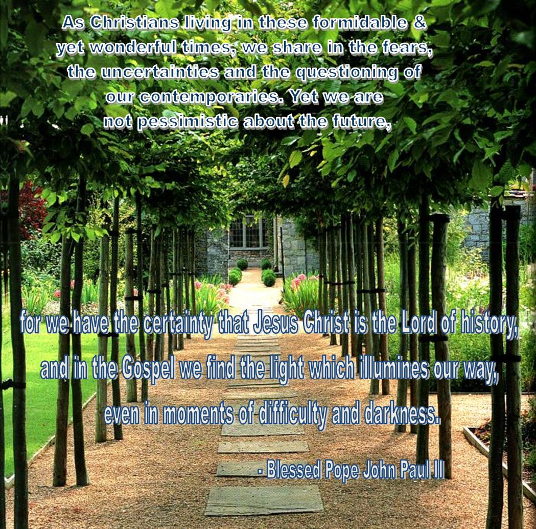 As Christians living in these formidable and yet wonderful times, we share in the fears, the uncertainties and the questioning of our contemporaries. Yet we are not pessimistic about the future, for we have the certainty that Jesus Christ is the Lord of history, and in the Gospel we find the light which illumines our way, even in moments of difficulty and darkness.