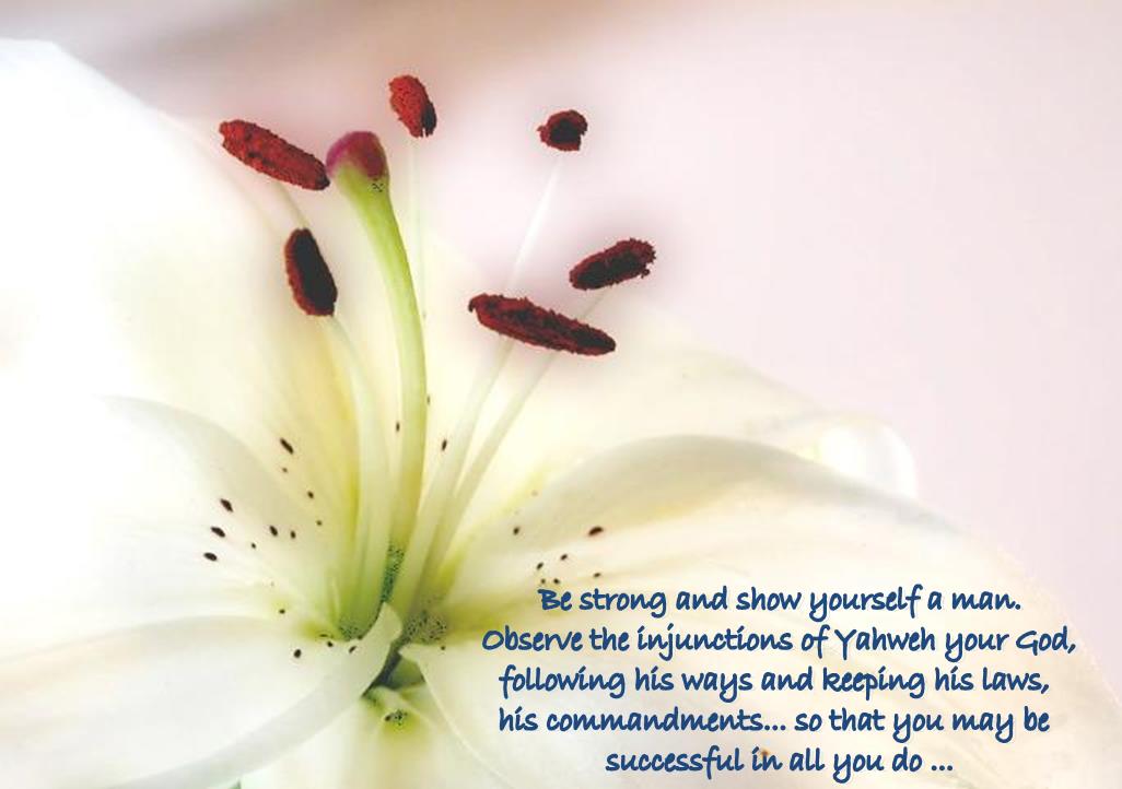 Be strong and show yourself a man. Observe the injunctions of Yahweh your God, following his ways and keeping his laws, his commandments, his customs and his decrees, as it stands written in the Law of Moses, that so you may be successful in all you do and undertake, so that Yahweh may fulfill the promise he made me,