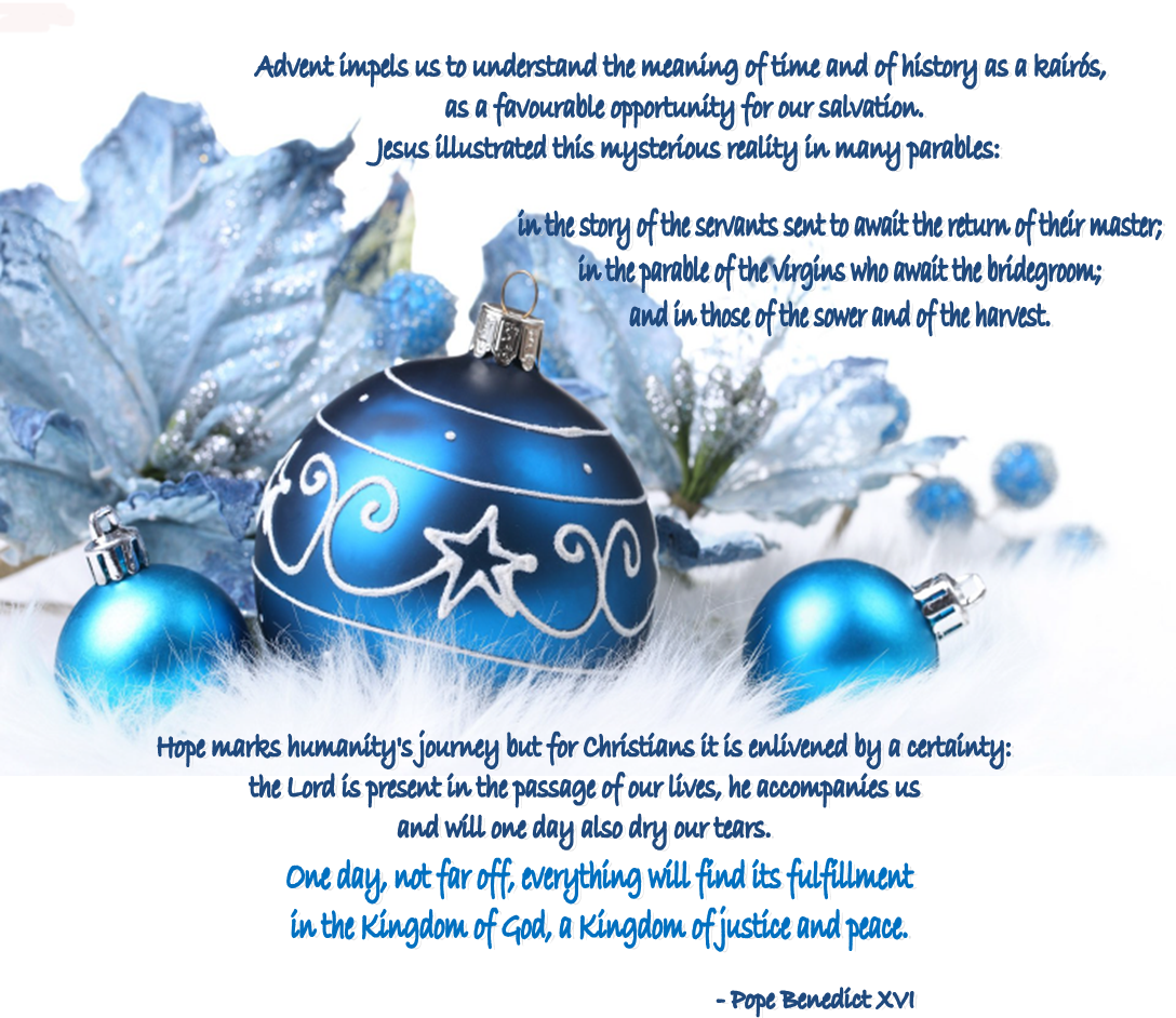 Dear friends, Advent is the season of the presence and expectation of the eternal. For this very reason, it is in a particular way a period of joy, an interiorized joy that no suffering can diminish. It is joy in the fact that God made himself a Child. This joy, invisibly present within us, encourages us to journey on with confidence. A model and support of this deep joy is the Virgin Mary, through whom we were given the Infant Jesus. May she, a faithful disciple of her Son, obtain for us the grace of living this liturgical season alert and hardworking, while we wait. Amen!