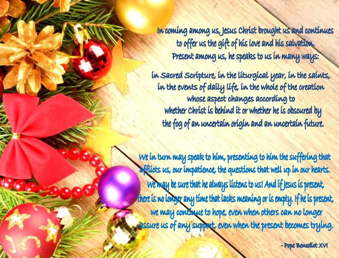 However there are many different ways of waiting. If time is not filled by a present endowed with meaning expectation risks becoming unbearable; if one expects something but at a given moment there is nothing, in other words if the present remains empty, every instant that passes appears extremely long and waiting becomes too heavy a burden because the future remains completely uncertain. On the other hand, when time is endowed with meaning and at every instant we perceive something specific and worthwhile, it is then that the joy of expectation makes the present more precious. Dear brothers and sisters, let us experience intensely the present in which we already receive the gifts of the Lord, let us live it focused on the future, a future charged with hope. In this manner Christian Advent becomes an opportunity to reawaken within ourselves the true meaning of waiting, returning to the heart of our faith which is the mystery of Christ, the Messiah who was expected for long centuries and was born in poverty, in Bethlehem. In coming among us, he brought us and continues to offer us the gift of his love and his salvation. Present among us, he speaks to us in many ways: in Sacred Scripture, in the liturgical year, in the saints, in the events of daily life, in the whole of the creation whose aspect changes according to whether Christ is behind it or whether he is obscured by the fog of an uncertain origin and an uncertain future. We in turn may speak to him, presenting to him the suffering that afflicts us, our impatience, the questions that well up in our hearts. We may be sure that he always listens to us! And if Jesus is present, there is no longer any time that lacks meaning or is empty. If he is present, we may continue to hope, even when others can no longer assure us of any support, even when the present becomes trying. |
