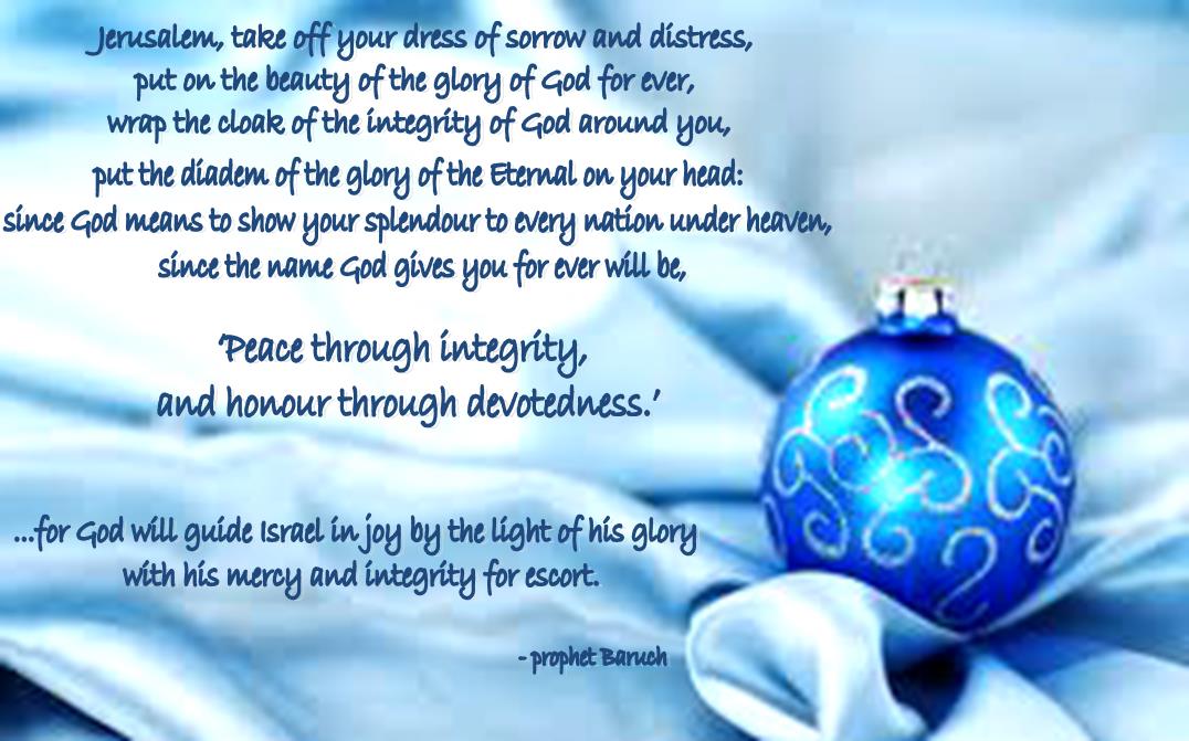 Jerusalem, take off your dress of sorrow and distress, put on the beauty of the glory of God for ever, wrap the cloak of the integrity of God around you,