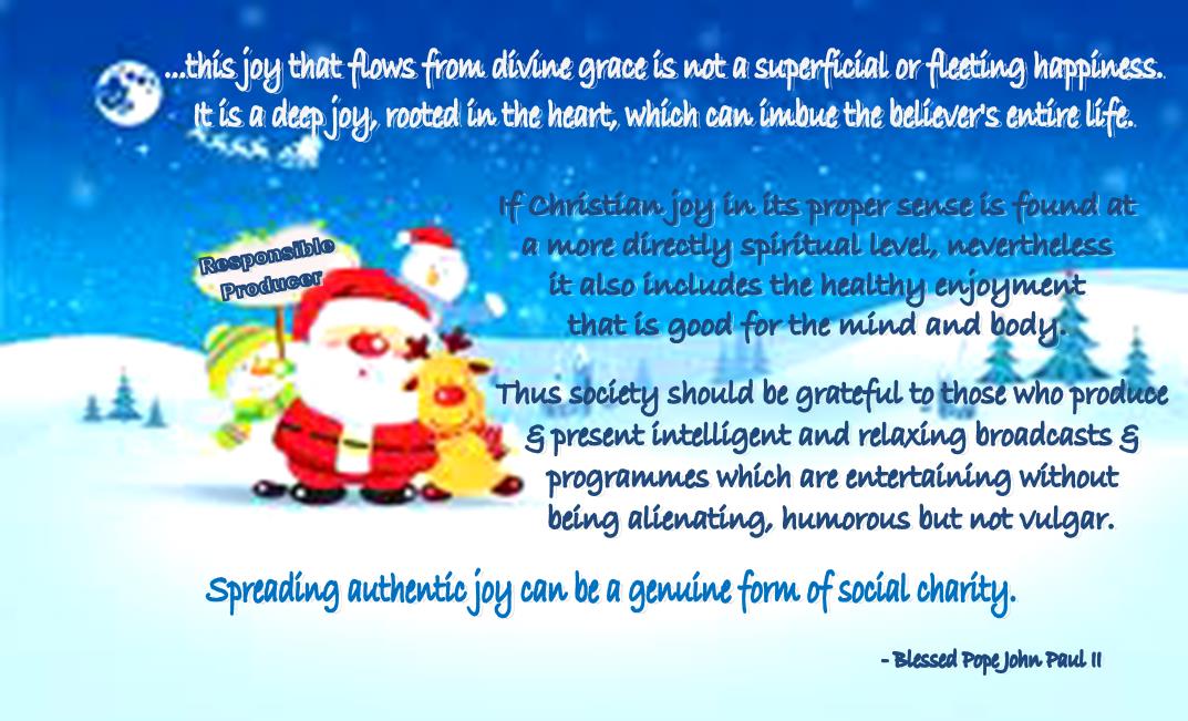 Many of you, dear friends, work to entertain the public in creating and producing shows that are meant to offer an opportunity for healthy relaxation and amusement. If Christian joy in its proper sense is found at a more directly spiritual level, nevertheless it also includes the healthy enjoyment that is good for the mind and body. Thus society should be grateful to those who produce and present intelligent and relaxing broadcasts and programmes which are entertaining without being alienating, humorous but not vulgar. Spreading authentic joy can be a genuine form of social charity. |