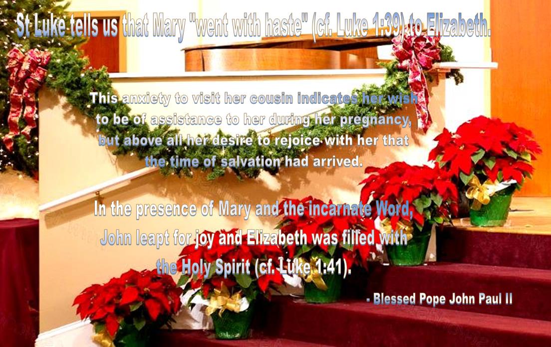 In today's Gospel passage we listened to the account of the Mother of God's visit to her elderly relative, Elizabeth. The first meeting between John the Baptist and Jesus takes place through their mothers' greeting. St Luke tells us that Mary "went with haste" (cf. Luke 1:39) to Elizabeth. This anxiety to visit her cousin indicates her wish to be of assistance to her during her pregnancy, but above all her desire to rejoice with her that the time of salvation had arrived. In the presence of Mary and the incarnate Word, John leapt for joy and Elizabeth was filled with the Holy Spirit (cf. Luke 1:41). |