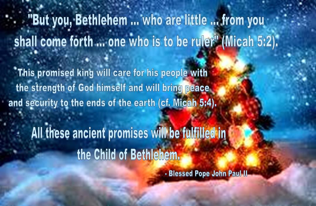 2. We find reflected in Mary's visitation the hopes and expectations of the humble, God-fearing people who were awaiting the fulfillment of the prophetic promises. The first reading from the Book of the Prophet Micah announces the coming of a new king, after God's heart. A king who will not try to display greatness and power, but who will rise from humble origins like David and, like him, will be wise and faithful to the Lord. "But you, Bethlehem ... who are little ... from you shall come forth ... one who is to be ruler" (Micah 5:2). This promised king will care for his people with the strength of God himself and will bring peace and security to the ends of the earth (cf. Micah 5:4). All these ancient promises will be fulfilled in the Child of Bethlehem. |
