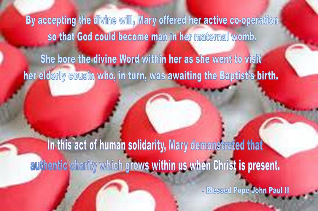 As I recalled a few moments ago, today's Gospel offers us the "missionary" episode of Mary's visit to Elizabeth. By accepting the divine will, Mary offered her active co-operation so that God could become man in her maternal womb. She bore the divine Word within her as she went to visit her elderly cousin who, in turn, was awaiting the Baptist's birth. In this act of human solidarity, Mary demonstrated that authentic charity which grows within us when Christ is present. |