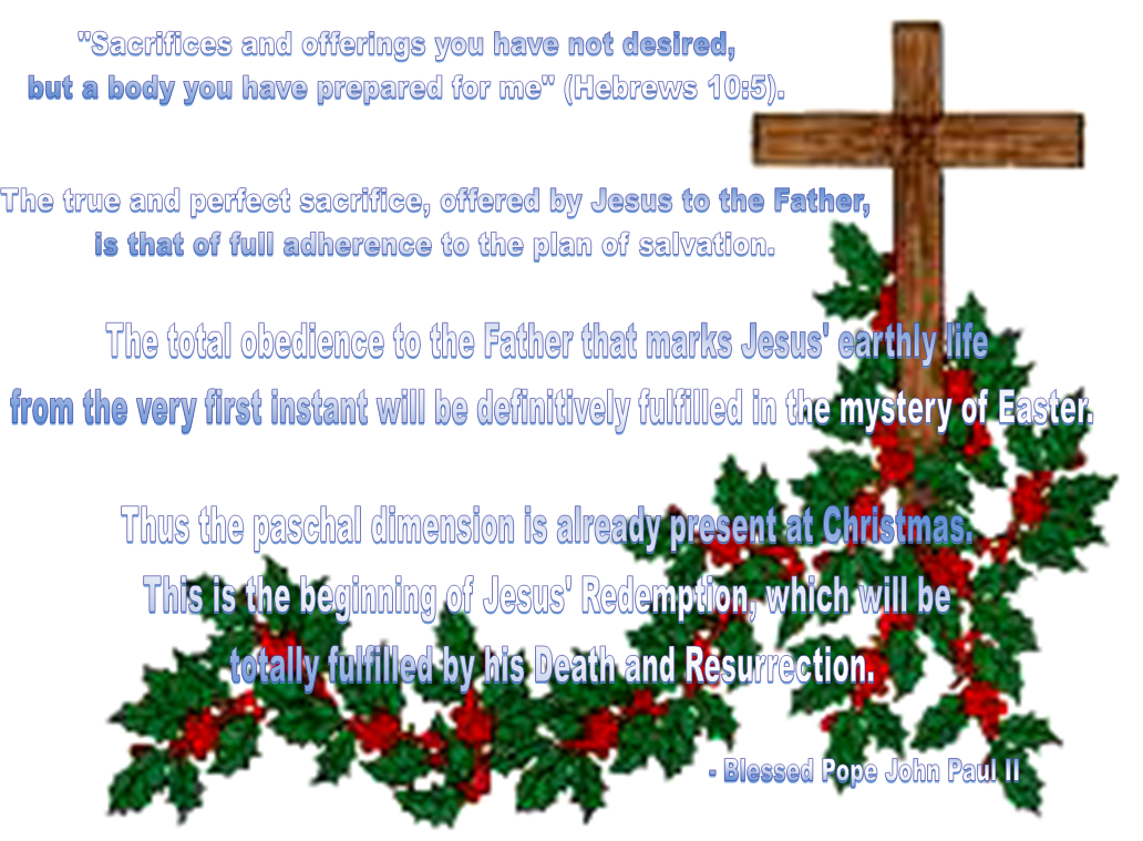 5. "Lo, I have come to do your will, O God" (Hebrews 10:7). In presenting the mystery of the Incarnation, the Letter to the Hebrews describes the attitude of the divine Word as he enters the world: "Sacrifices and offerings you have not desired, but a body you have prepared for me" (Hebrews 10:5). The true and perfect sacrifice, offered by Jesus to the Father, is that of full adherence to the plan of salvation. The total obedience to the Father that marks Jesus' earthly life from the very first instant will be definitively fulfilled in the mystery of Easter. Thus the paschal dimension is already present at Christmas. This is the beginning of Jesus' Redemption, which will be totally fulfilled by his Death and Resurrection.