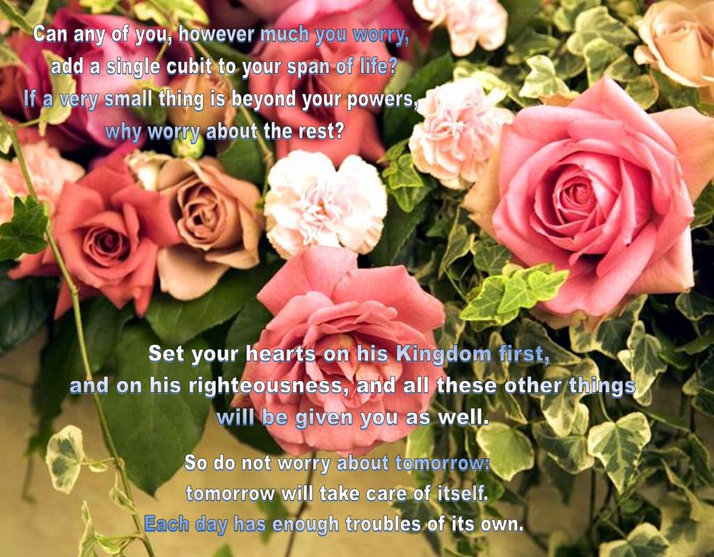 Set your hearts on his Kingdom first, and on his righteousness, and all these other things will be given you as well. So do not worry about tomorrow: tomorrow will take care of itself. Each day has enough troubles of its own. (Matthew 6 : 33-34)
