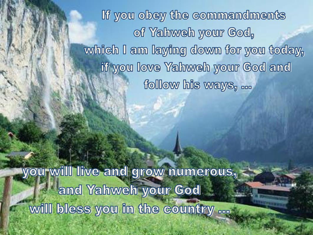 16 If you obey the commandments of Yahweh your God, which I am laying down for you today, if you love Yahweh your God and follow his ways, if you keep his commandments, his laws and his customs, you will live and grow numerous, and Yahweh your God will bless you in the country which you are about to enter and make your own.