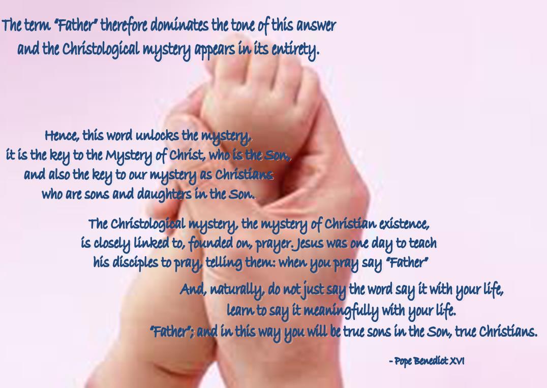 The term “Father” therefore dominates the tone of this answer and the Christological mystery appears in its entirety. Hence, this word unlocks the mystery, it is the key to the Mystery of Christ, who is the Son, and also the key to our mystery as Christians who are sons and daughters in the Son. At the same time Jesus teaches us to be children by being with the Father in prayer. The Christological mystery, the mystery of Christian existence, is closely linked to, founded on, prayer. Jesus was one day to teach his disciples to pray, telling them: when you pray say “Father”. And, naturally, do not just say the word say it with your life, learn to say it meaningfully with your life. “Father”; and in this way you will be true sons in the Son, true Christians.