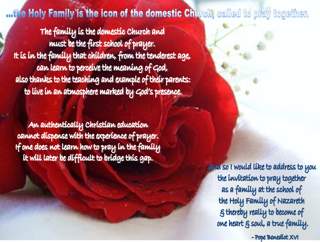 Dear friends, because of these different aspects that I have outlined briefly in the light of the Gospel, the Holy Family is the icon of the domestic Church, called to pray together. The family is the domestic Church and must be the first school of prayer. It is in the family that children, from the tenderest age, can learn to perceive the meaning of God, also thanks to the teaching and example of their parents: to live in an atmosphere marked by God’s presence. An authentically Christian education cannot dispense with the experience of prayer. If one does not learn how to pray in the family it will later be difficult to bridge this gap. And so I would like to address to you the invitation to pray together as a family at the school of the Holy Family of Nazareth and thereby really to become of one heart and soul, a true family. Many thanks. 5 January 2013