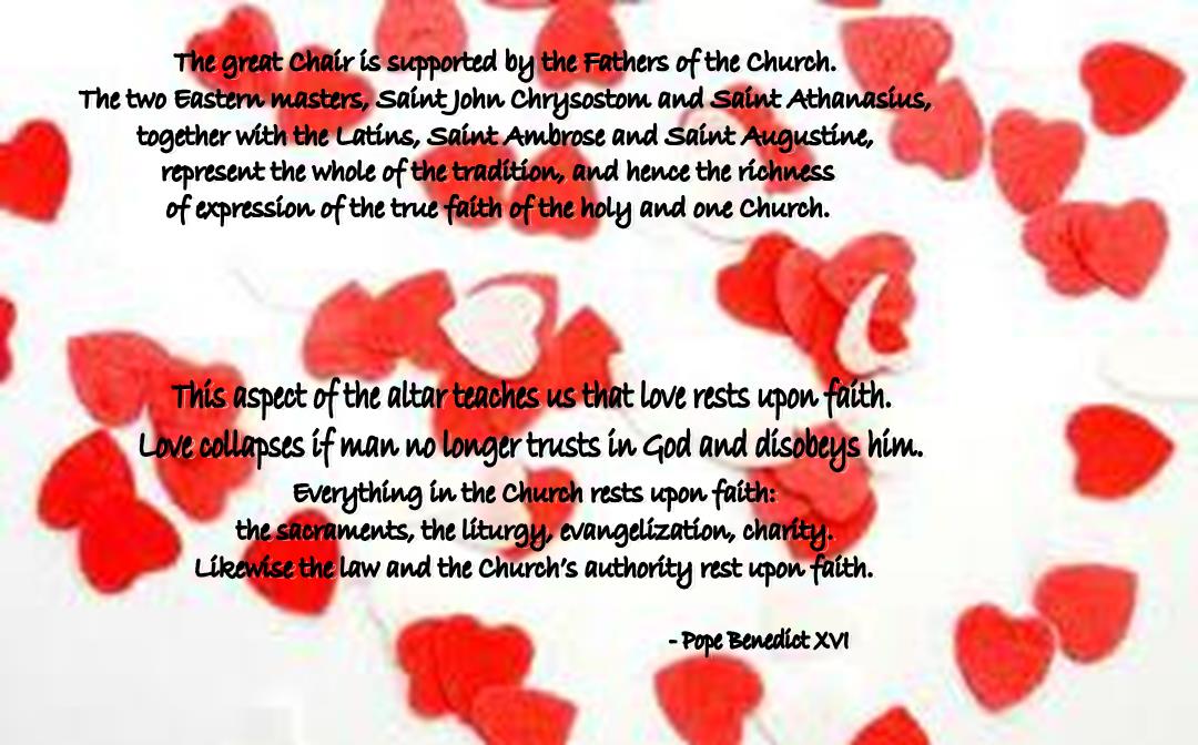 After considering the various elements of the altar of the Chair, let us take a look at it in its entirety. We see that it is characterized by a twofold movement: ascending and descending. This is the reciprocity between faith and love. The Chair is placed in a prominent position in this place, because this is where Saint Peter’s tomb is located, but this too tends towards the love of God. Indeed, faith is oriented towards love. A selfish faith would be an unreal faith. Whoever believes in Jesus Christ and enters into the dynamic of love that finds its source in the Eucharist, discovers true joy and becomes capable in turn of living according to the logic this gift. True faith is illumined by love and leads towards love, leads on high, just as the altar of the Chair points upwards towards the luminous window, the glory of the Holy Spirit, which constitutes the true focus for the pilgrim’s gaze as he crosses the threshold of the Vatican Basilica. That window is given great prominence by the triumphant angels and the great golden rays, with a sense of overflowing fullness that expresses the richness of communion with God. God is not isolation, but glorious and joyful love, spreading outwards and radiant with light.