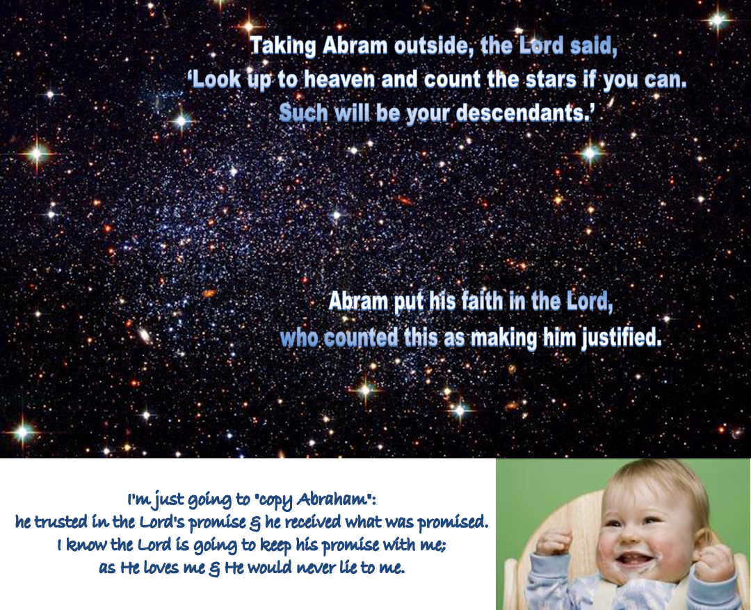 Taking Abram outside, the Lord said, ‘Look up to heaven and count the stars if you can. Such will be your descendants.’ Abram put his faith in the Lord, who counted this as making him justified.