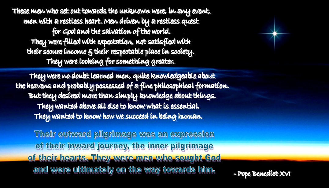 These men who set out towards the unknown were, in any event, men with a restless heart. Men driven by a restless quest for God and the salvation of the world. They were filled with expectation, not satisfied with their secure income and their respectable place in society. They were looking for something greater. They were no doubt learned men, quite knowledgeable about the heavens and probably possessed of a fine philosophical formation. But they desired more than simply knowledge about things. They wanted above all else to know what is essential. They wanted to know how we succeed in being human. And therefore they wanted to know if God exists, and where and how he exists. Whether he is concerned about us and how we can encounter him. Nor did they want just to know. They wanted to understand the truth about ourselves and about God and the world. Their outward pilgrimage was an expression of their inward journey, the inner pilgrimage of their hearts. They were men who sought God and were ultimately on the way towards him. They were seekers after God. |