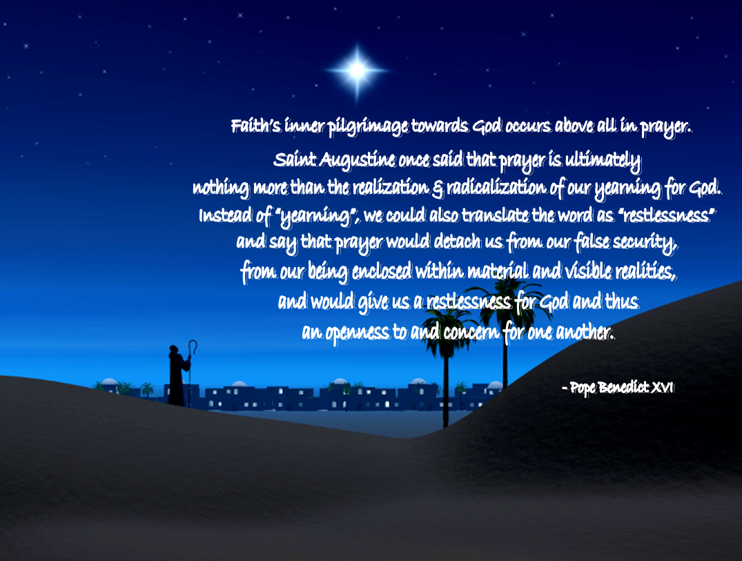 Faith’s inner pilgrimage towards God occurs above all in prayer. Saint Augustine once said that prayer is ultimately nothing more than the realization and radicalization of our yearning for God. Instead of “yearning”, we could also translate the word as “restlessness” and say that prayer would detach us from our false security, from our being enclosed within material and visible realities, and would give us a restlessness for God and thus an openness to and concern for one another. The Bishop, as a pilgrim of God, must be above all a man of prayer. He must be in constant inner contact with God; his soul must be open wide to God. He must bring before God his own needs and the needs of others, as well as his joys and the joys of others, and thus in his own way establish contact between God and the world in communion with Christ, so that Christ’s light can shine in the world.