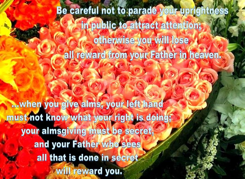 1 'Be careful not to parade your uprightness in public to attract attention; otherwise you will lose all reward from your Father in heaven.