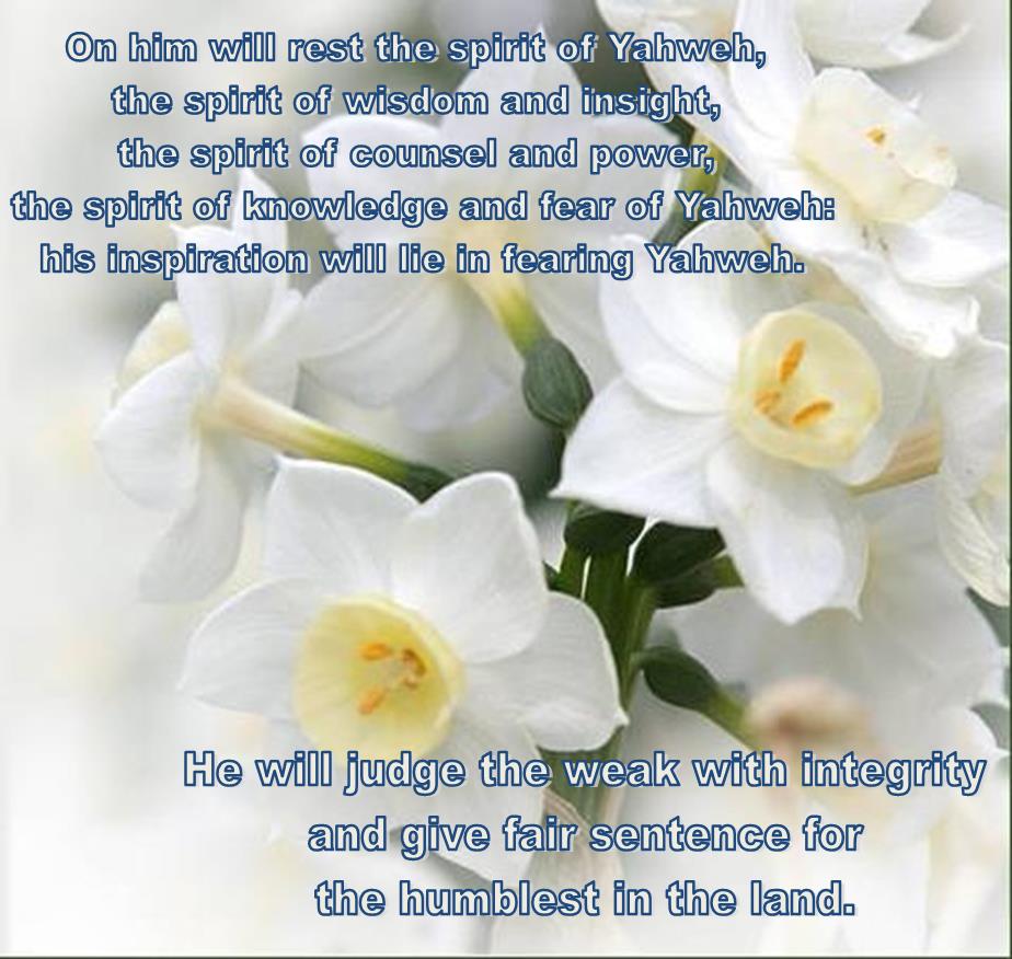 The following refers to Jesus Christ, the Savoir of the World: Extracted from Isaiah, Chapter 11: 1 A shoot will spring from the stock of Jesse, a new shoot will grow from his roots.