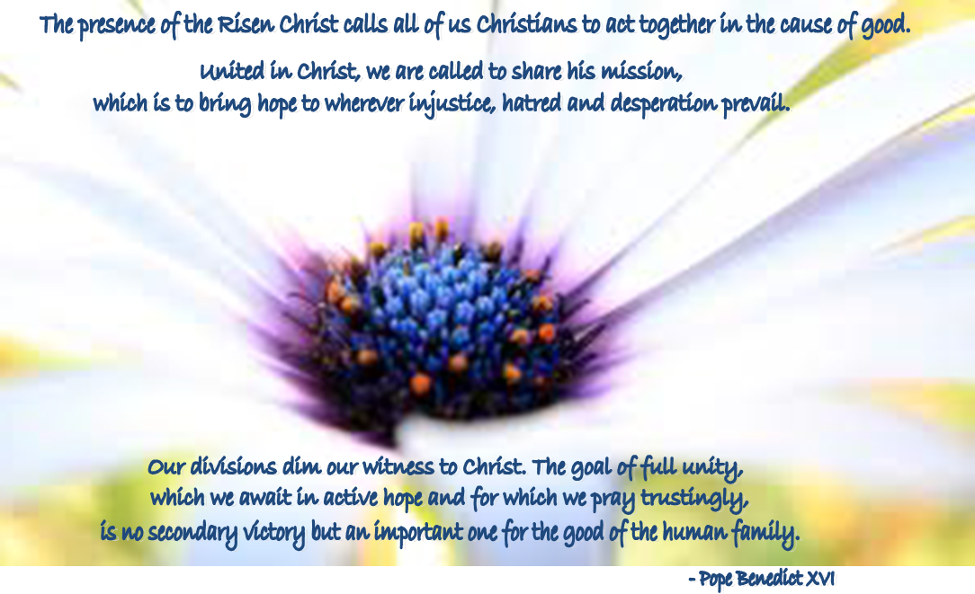 The presence of the Risen Christ calls all of us Christians to act together in the cause of good. United in Christ, we are called to share his mission, which is to bring hope to wherever injustice, hatred and desperation prevail. Our divisions dim our witness to Christ. The goal of full unity, which we await in active hope and for which we pray trustingly, is no secondary victory but an important one for the good of the human family. |