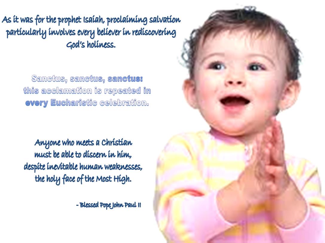 As it was for the prophet Isaiah, proclaiming salvation particularly involves every believer in rediscovering God’s holiness. Sanctus, sanctus, sanctus: this acclamation is repeated in every Eucharistic celebration. Anyone who meets a Christian must be able to discern in him, despite inevitable human weaknesses, the holy face of the Most High.