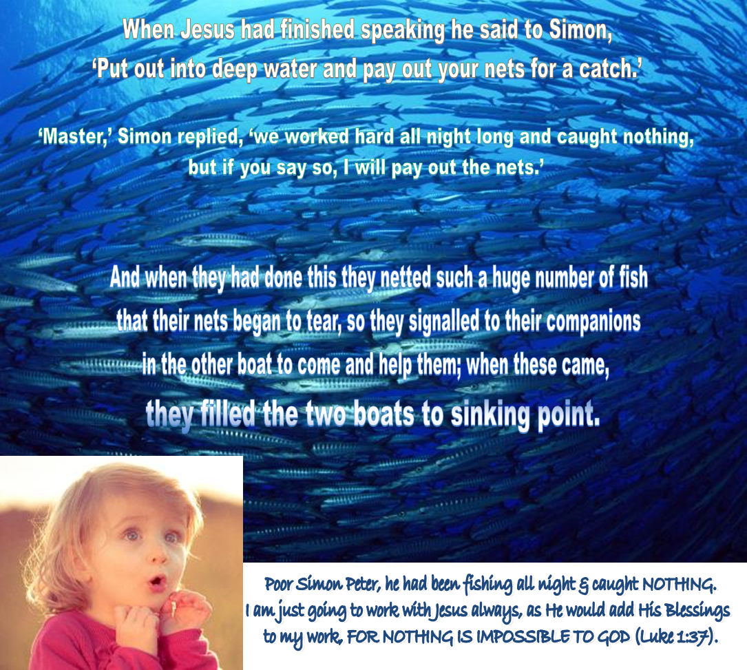 When he had finished speaking he said to Simon, ‘Put out into deep water and pay out your nets for a catch.’ ‘Master,’ Simon replied, ‘we worked hard all night long and caught nothing, but if you say so, I will pay out the nets.’ And when they had done this they netted such a huge number of fish that their nets began to tear, so they signaled to their companions in the other boat to come and help them; when these came, they filled the two boats to sinking point.