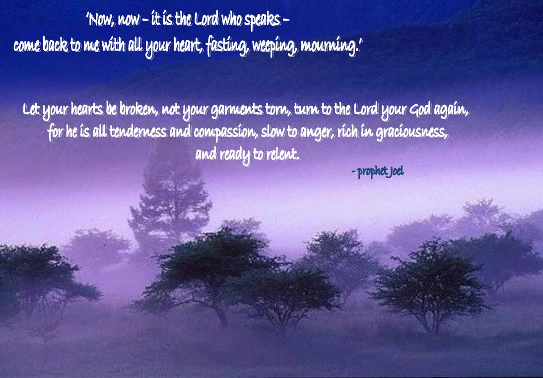 Let your hearts be broken, not your garments torn, turn to the Lord your God again, for he is all tenderness and compassion, slow to anger, rich in graciousness, and ready to relent.