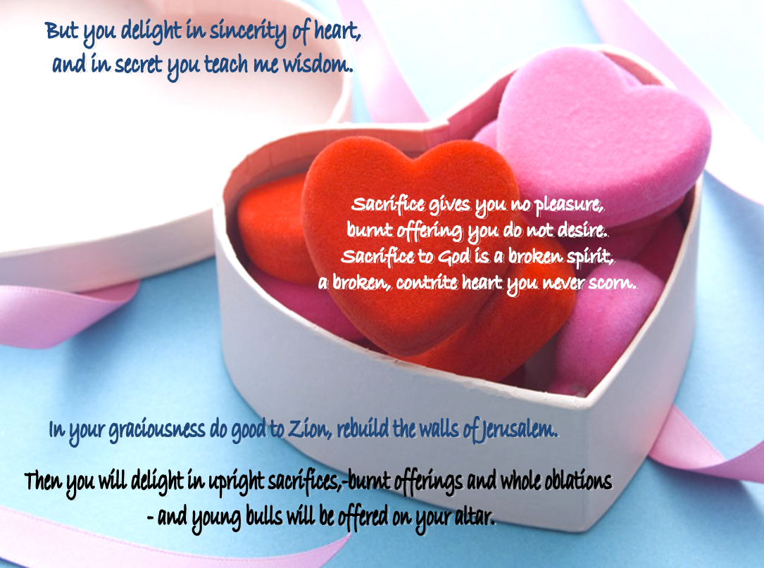 16 Sacrifice gives you no pleasure, burnt offering you do not desire. 17 Sacrifice to God is a broken spirit, a broken, contrite heart you never scorn. 18 In your graciousness do good to Zion, rebuild the walls of Jerusalem. 19 Then you will delight in upright sacrifices,-burnt offerings and whole oblations - and young bulls will be offered on your altar. |