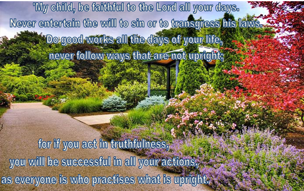 5 'My child, be faithful to the Lord all your days. Never entertain the will to sin or to transgress his laws. Do good works all the days of your life, never follow ways that are not upright;