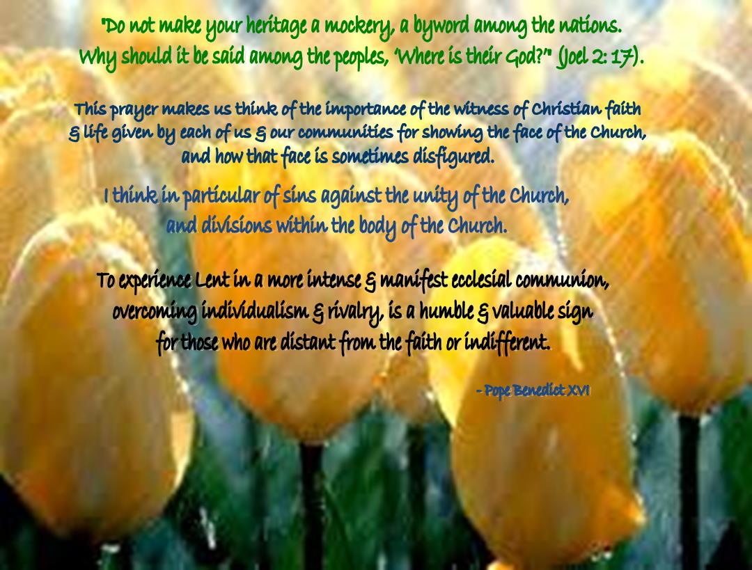 Finally, the prophet considers the prayer of the priests, who turn to God with tears, saying: "Do not make your heritage a mockery, a byword among the nations. Why should it be said among the peoples, ‘Where is their God?’" (v. 17). This prayer makes us think of the importance of the witness of Christian faith and life given by each of us and our communities for showing the face of the Church, and how that face is sometimes disfigured. I think in particular of sins against the unity of the Church, and divisions within the body of the Church. To experience Lent in a more intense and manifest ecclesial communion, overcoming individualism and rivalry, is a humble and valuable sign for those who are distant from the faith or indifferent.